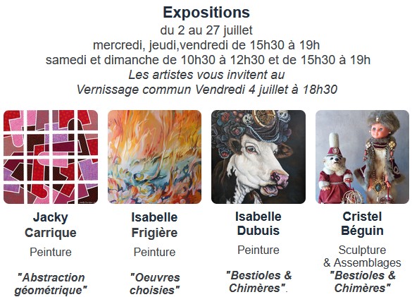 Du 2 au 27 juillet : Expositions de peintures, de sculptures et d'assemblage.