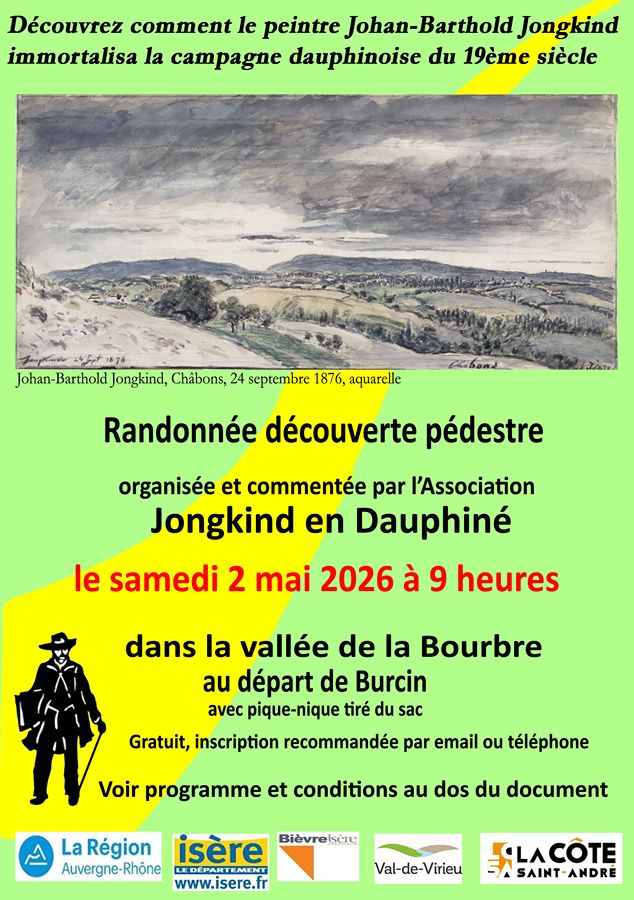 Randonnée découverte pédestre dans la vallée de la Bourbre le 02 mai 2026. Vous pourrez tout au long de ce parcours découvrir la vie et l’oeuvre de Johan-Barthold Jongkind, ami de Claude Monet. Vous retrouverez certains des paysages peints par Jongkind sur les neuf lutrins du parcours. Ce parcours vous permettra de découvrir les plus beaux éléments du patrimoine local : maisons bourgeoises de Burcin, ferme dauphinoise du 19ème siècle à Châbons, architecture du vieux bourg de Val-de-Virieu et également les châteaux de Pupetières et de Virieu. Enfin vos accompagnateurs vous rappelleront le passage dans ces lieux d’autres personnalités très célèbres. Programme → 9h : accueil place de l’église à Burcin et visite du village / 10h : départ à pied de la gare de Châbons / 12h30 : pique-nique tiré des sacs à la chapelle de Milin / 17h00 : arrivée au château de Virieu et collation offerte par l'association / Puis retour en voiture à la gare de Châbons.