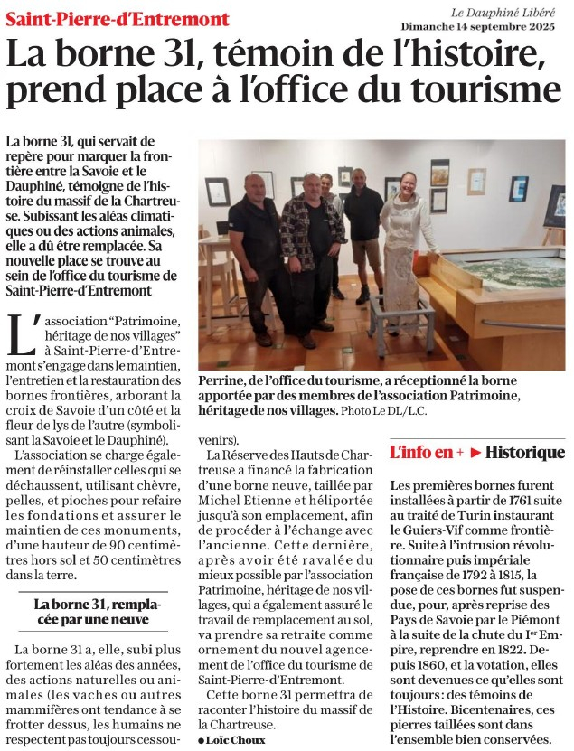 Sous l'égide de l'association Patrimoine héritage de nos vilages et de la Réserve des Hauts de Chartreuse, une copie de la borne frontière n° 31, taillée par Michel Etienne, a été remise en place. La borne originale, très endommagée, est maintenant exposée à l'Office du Tourisme de Saint-Pierre d'Entrement.