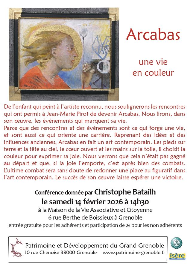 "Arcabas, une vie en couleur", une conférence donnée par Christophe Batailh le samedi 14 février 2026 à 14h30 à la Maison de la Vie Associative et Citoyenne 6 rue Berthe de Boissieux à Grenoble.