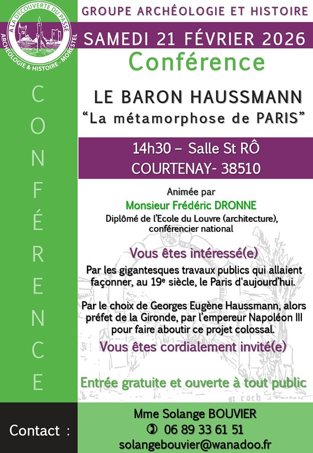 Samedi 21 février 2026 à 14h30, salle St Rô à Courtenay : Conférence "Le baron Haussmann - La métamorphose de Paris" animée Monsieur Frédéric Dronne.